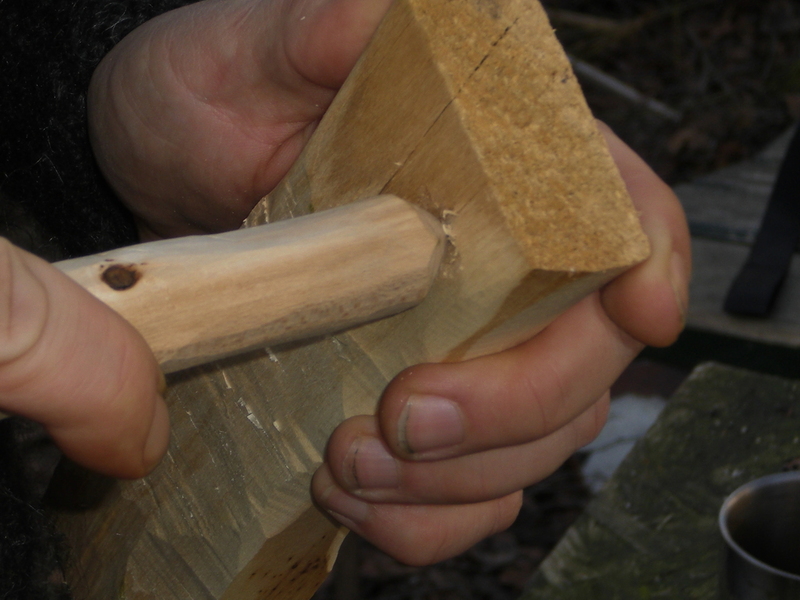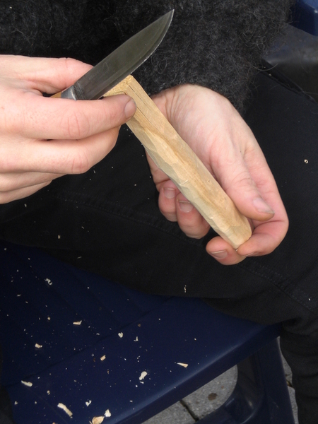 | Die Spindel wird erstmal grob rund geschnitzt.