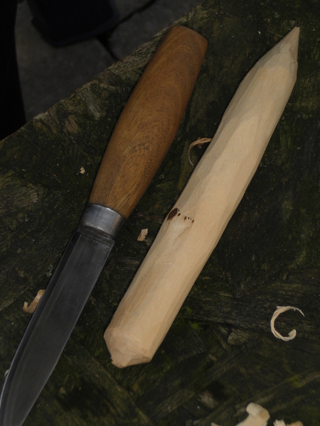 Naja, noch nicht ganz, ein wenig Feinarbeit fehlt noch... Aber man kann schon sehen wie der Holzklotz sich verändert hat. Ein Ende der Spindel bekommt eine flach auslaufende Spitze und das andere Ende eine stumpfe Spitze. |