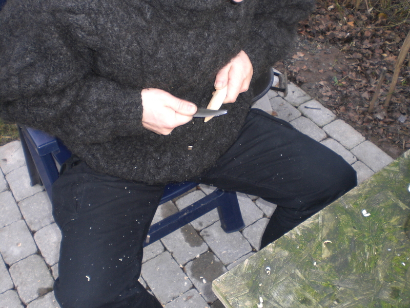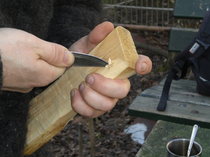 Jeder kennt das "Standardschnitzen"... einfach Messer in die Hand und mit den Armmuskeln die Kraft ausüben. Also so, wie es alle machen, wenn sie mal fix einen Stock anspitzen wollen... Wenn ihr nicht gerade Handwerker seid, die jeden Tag mit ihren Armen am arbeiten sind, sind eure Armmuskeln in knapp 5min erschöpft. Die komplette Kraft kommt aus den Armen beim "Standartschnitzen"... Wenn ihr mit dem Messer so vor der Brust schnitzt, wie es auf meinem Bild dargestellt ist, kommt die Kraft mehr aus den Schultermuskeln. Ihr könnt wesentlich länger arbeiten und habt auch mehr Kontrolle über die Schnitte. Desweiteren kann man mit der Technik auch wesentlich größere Stücke heraus schnitzen. So nen Vampirpflock habt ihr dann in nullkommnichts fertig! :) Ehrlich, übt das ein wenig, ihr werdet echt dankbar sein! |