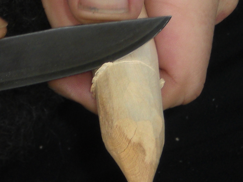 | Die grobe Spindel wird nun mit einem Messer in Form gebracht.