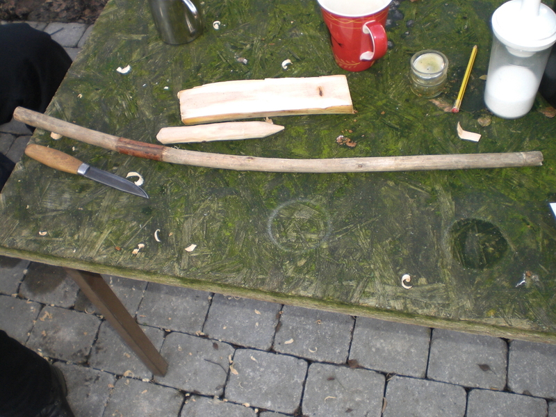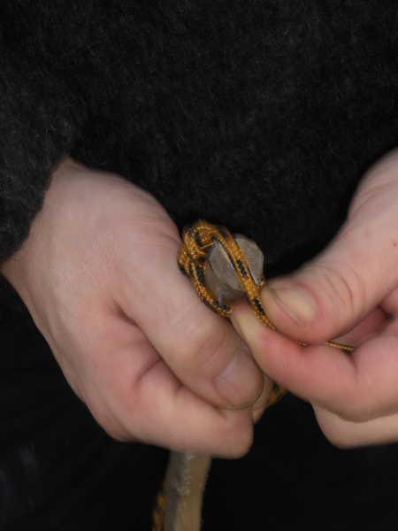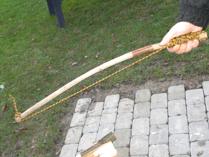 Das Holz ansich ist leicht gebogen, also kein Flitzebogen! :) Ich habe hier nun eine Reebschnur verwendet, ist insgesamt 3m lang und in einem Shop für Kletterbedarf gekauft. Man kann natl. auch Paracord oder wenn man es so richtig authentisch mag, selbstgedrehte Schnur aus natürlichen Materialien nehmen. evtl. mach ich noch mal was zu flämischen Spleißen, das ist so die einfachste Möglichkeit sich Schnur/Band/Seil mal fix selber zu machen... |