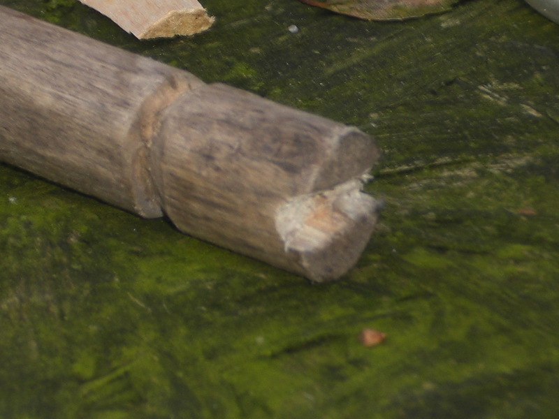 | Unten am Griff habe ich nur auf der Stirnseite eine Kerbe hinein geschnitten. Beide Kerben sind in die selbe Richtung deutend und wenn man den Bogen wie einen normalen "Flitzebogen" halten würde, würden sie zu einem hin zeigen. |