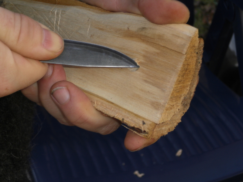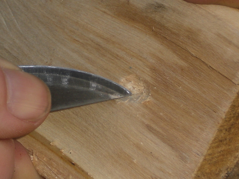| An der dicksten Stelle bohre ich mit dem Messer eine kleine Kerbe hinein. | ![]() |