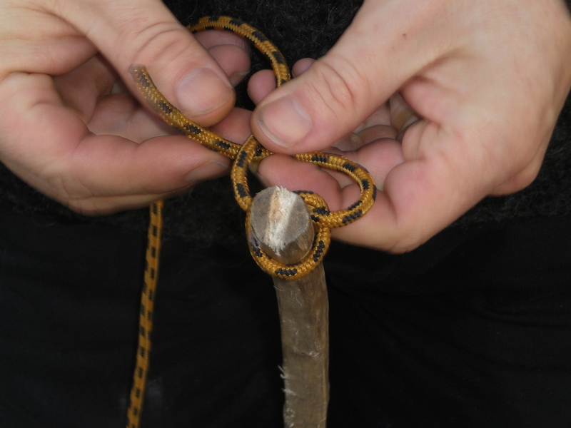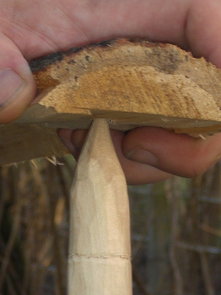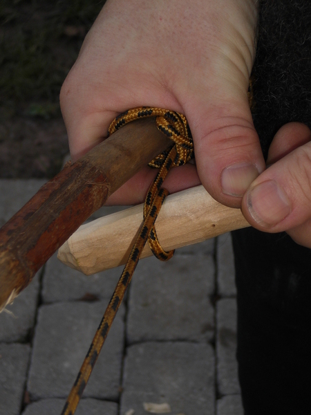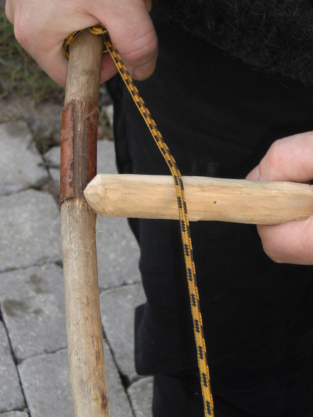 Wenn ein starrer Ast verwendet wird und nicht so wie bei mir ein flexibler Bogen, dann die Schnur so straff spannen, das die Spindel gerade noch so eingespannt werden kann.