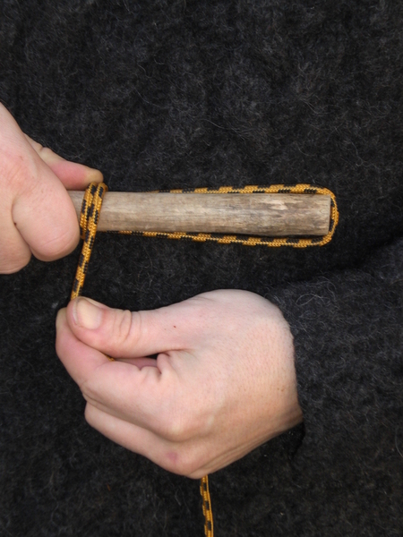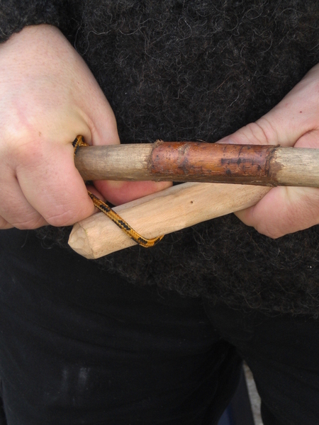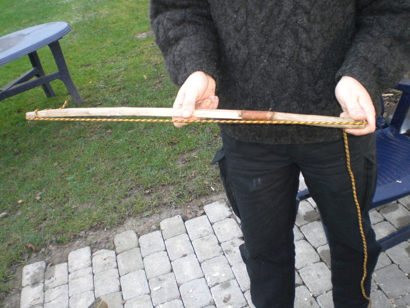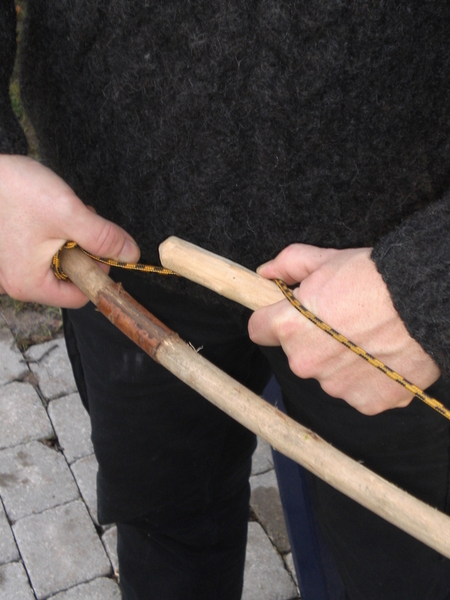 Bogen in die rechte Hand, Schnur nach innen zeigend. Spindel in die linke Hand und mit dem stumpfen Ende zum Bogen zeigend von unten an die Schnur. Man kann gut erkennen, das der Bogen wirklich nur leicht gespannt ist, da die Schnur sich gut nach oben bewegt. |
