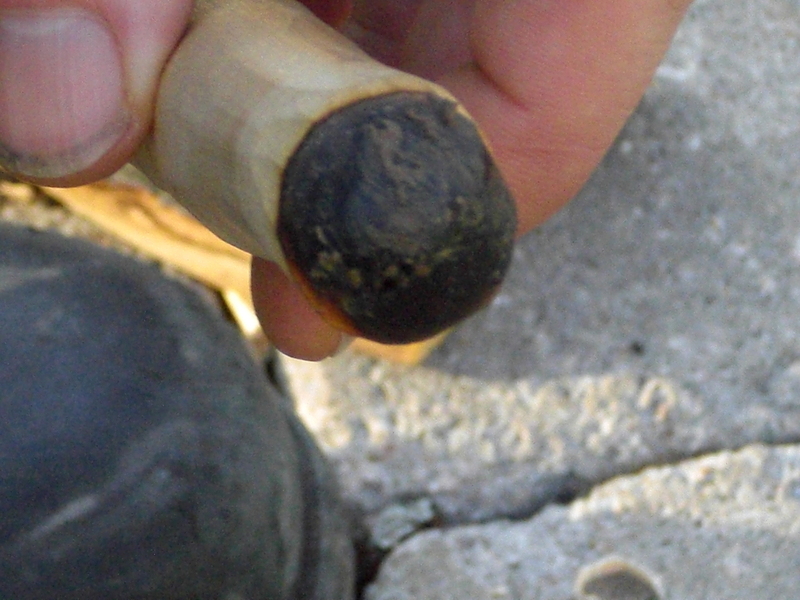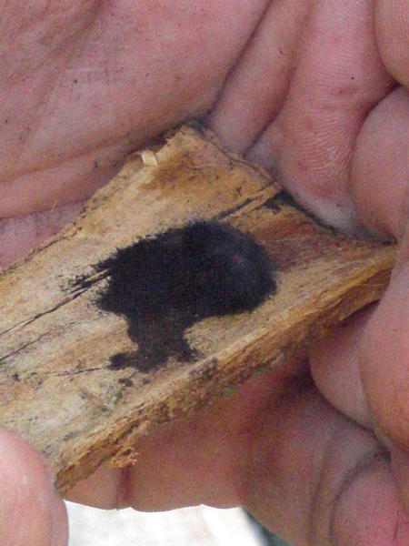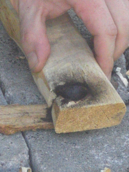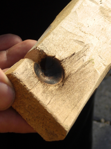 | So ein Brett kann man ja durchaus mehrfach benutzen... Hier sieht man, dass das braune und verkohlte so ein klein wenig schimmert. Das ist dann wie poliert und bildet eine harte glatte Fläche, wo die Spindel nicht mehr richtig fassen kann und beim bohren unsäglich anfängt zu quietschen. |
