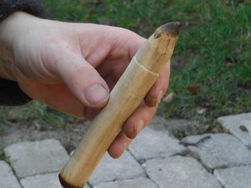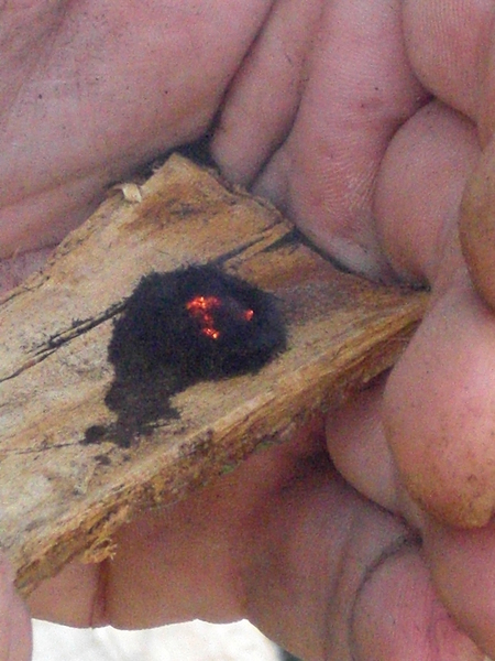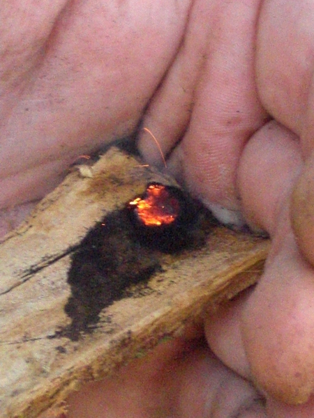 | Nachdem nun das Feuerbohrset wieder frisch generalüberholt ist kommt nun der nächste Versuch... Also wieder alles in Ausgangsstellung! Durch das "Tunen" der Spindel mit Sand als Schleifmittel und der frisch angespitzten (und geschmierten!) Spindelspitze fürs Handstück, geht gleich alles doppelt so gut! |